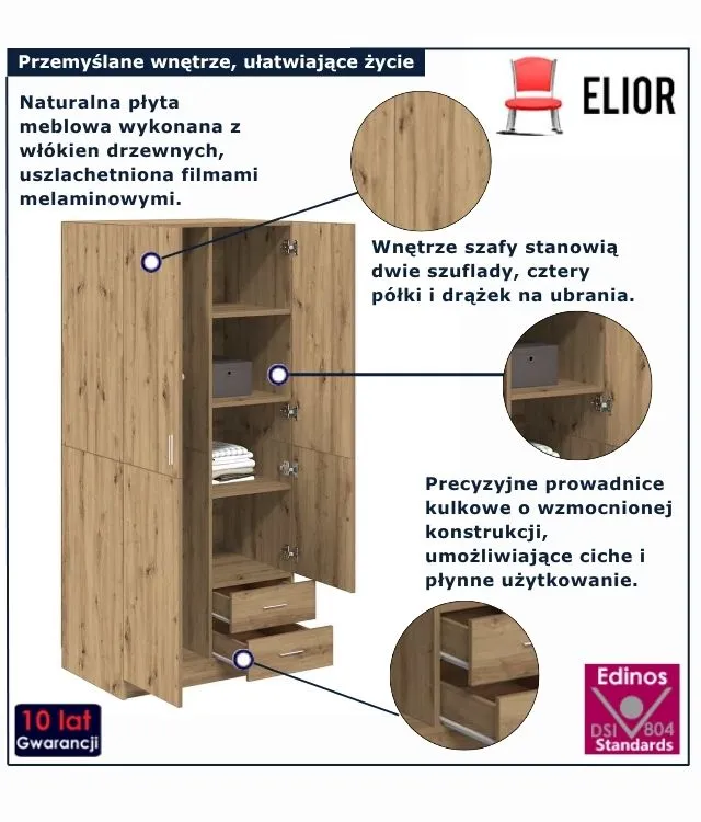 • Kompaktowe wymiary pozwalają zmieścić ją nawet w mniejszych wnętrzachnowoczesna szafa dąb artisan Cleoni