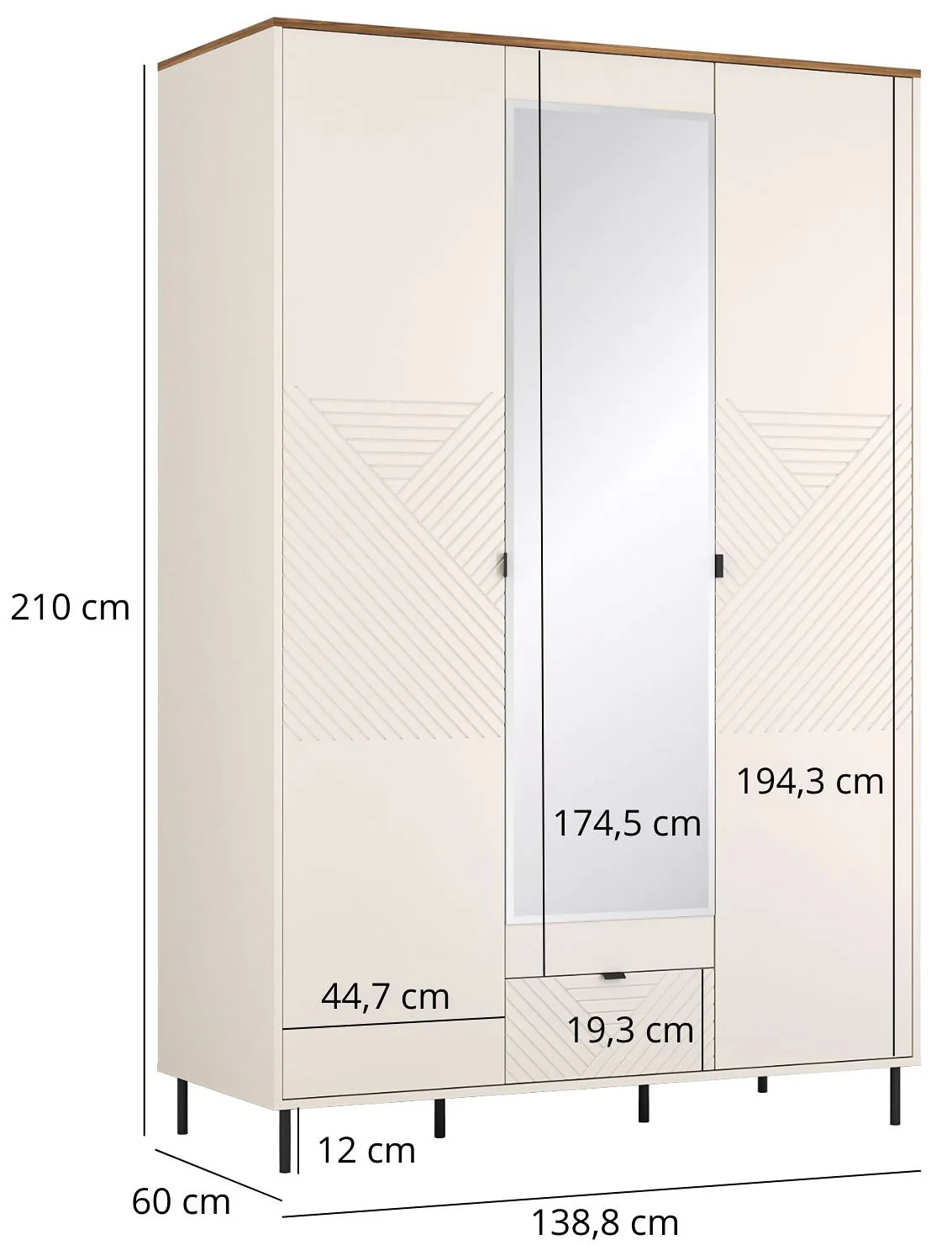 • Szerokość: 138,8 cm, wysokość: 210 cm, głębokość 60 cm.