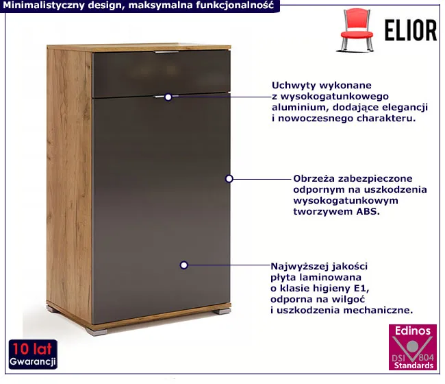 • Produkt posiada certyfikat jakości "Edinos Standards DSI 804", który potwierdza najwyższą jakość wykonania mebla oraz pełny stopień zgodności poszczególnych jednostek wytworzonego wyrobu z przyjętym wzorcem.