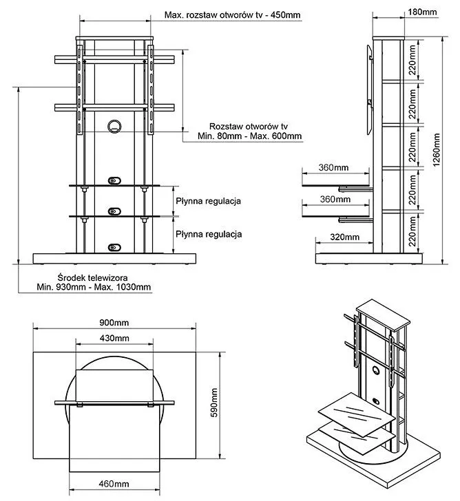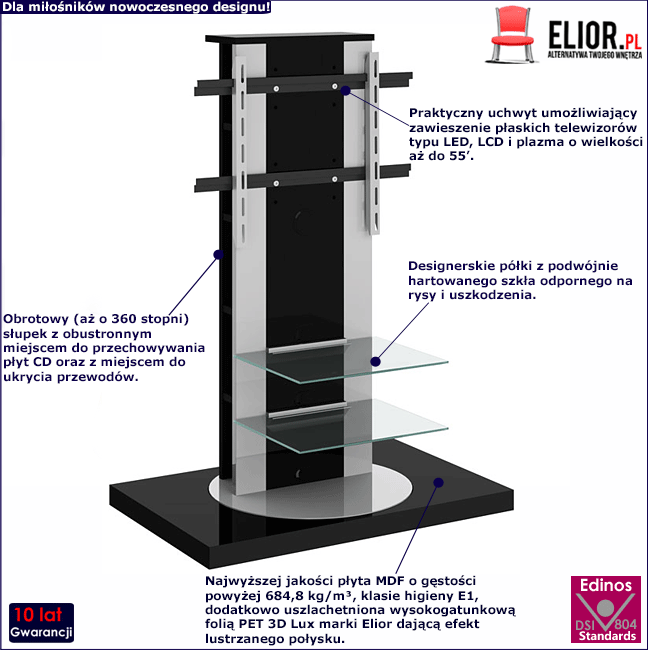 • Stolik RTV Koncept oprócz półek składa się także z solidnej podstawy oraz obrotowego słupka wraz z uchwytem, na którym zawiesisz płaski telewizor do 55 cali. Korpus mebla dodatkowo wyposażony został w obustronne półki służące do przechowywania płyt CD oraz w miejsce do ukrycia przewodów.