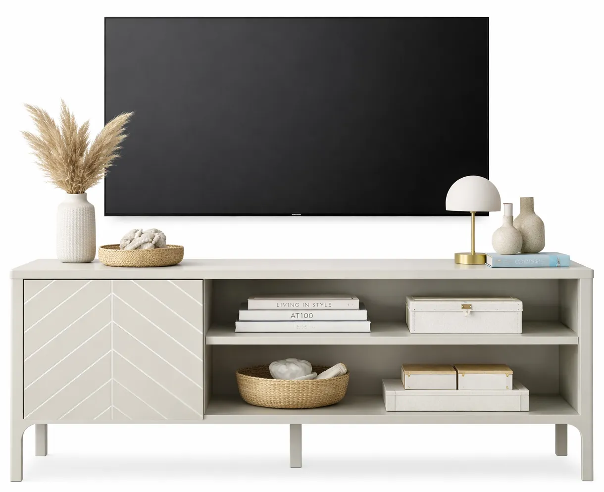 Nowoczesna szafka Sageri 8X to praktyczne i eleganckie uzupełnienie strefy wypoczynkowej. Jej prosty, minimalistyczny kształt z ozdobnym frontem w jodełkę doskonale wpisuje się w aktualne wnętrzarskie trendy. Otwarta przestrzeń z półkami sprawdzi się idealnie na sprzęt elektroniczny, a zamykana szafka pomieści kable, akcesoria czy dokumenty. Stabilna konstrukcja i wysokiej jakości materiały gwarantują trwałość, a kaszmir nadaje meblowi eleganckiego wykończenia.