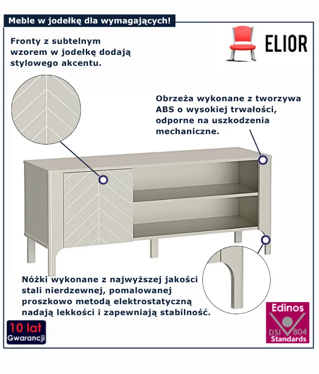 • Produkt posiada certyfikat jakości "Edinos Standards DSI 804", który potwierdza najwyższą jakość wykonania mebla oraz pełny stopień zgodności poszczególnych jednostek wytworzonego wyrobu z przyjętym wzorcem.