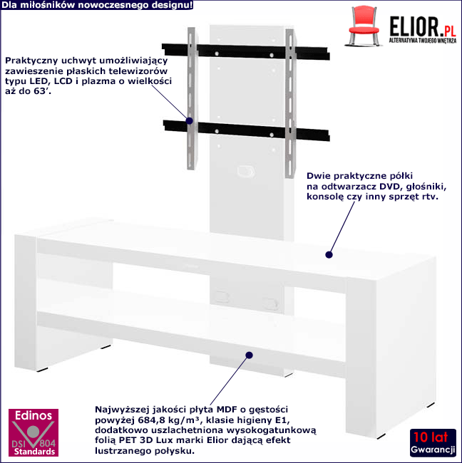 Meble marki Elior to produkty nowej generacji, które nieustannie zaskakują współczesną branżę meblarską. Odkrywamy i tworzymy nowe fascynujące nurty w designie, których Ty także możesz być częścią. Zapewniamy Cię, że proponowana szafka RTV Argo 2X marki Elior to stylowy i dopracowany pod względem wzornictwa najwyższej klasy mebel, który spełni Twoje oczekiwania zarówno w zakresie jakości, jak i praktyczności użytkowania. Poznaj atuty prezentowanego stolika RTV Argo 2X: