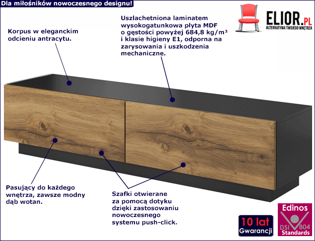 Sprzęt RTV to nieodłączny element wyposażenia każdego salonu, pokoju dziennego, a nawet sypialni. Warto wygospodarować dogodną przestrzeń, w której na stałe zagości nasz telewizor czy inny sprzęt RTV. Każdemu z nas należy się relaks, marka Elior doskonale to rozumie i dlatego zaprojektowała jedyną w swoim rodzaju stojącą szafkę RTV Vitoria 6X. Projektanci marki Elior stworzyli mebel, który odnajdzie się we wnętrzach, w których króluje prostota i minimalizm. Jest to szafka o niepowtarzalnym stylu, w którym funkcjonalność idzie w parze z estetyką. Esencja takiego wyglądu tkwi w najwyższej jakości materiałów, z których powstał mebel. Użyty do produkcji szafki surowiec to wysokogatunkowa, uszlachetniona cienkimi filmami melaminowymi płyta MDF. Zastosowanie włókien o strukturze sinusoidalnej, to inwestycja w mebel o podwyższonej odporności na zarysowania, wilgoć i inne uszkodzenia mechaniczne. Ciepłe wybarwienie dębu wotanu to podkreślenie przytulnego charakteru pomieszczenia, w którym szafka RTV Vitoria 6X będzie miała okazję zagościć. Naturalny odcień drewna to znakomity kompan dla korpusu o tajemniczym, matowym wybarwieniu. Antracyt, bo o nim mowa to bardzo ciemny, głęboki odcień szarości – bliski czerni, ale nieco od niej łagodniejszy, lekko spłowiały. Takie połączenie kolorów to świetny sposób na pomysłowo, a zarazem nowocześnie i elegancko urządzone wnętrze. Drzwiczki z systemem push-click (szafka nie posiada uchwytów - otwierana jest za pomocą dotyku) wyposażone w profesjonalne siłowniki gazowe gwarantują Ci niezwykle funkcjonalne korzystanie z mebla. Szafka Vitoria 6X to stylowy, funkcjonalny i solidny mebel, który przypadnie do gustu nawet najbardziej wymagającym użytkownikom. Ty też się w niej zakochasz.