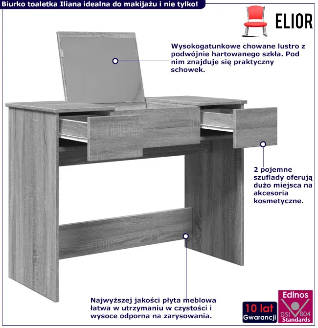 • Kolor: szary dąb sonoma. W naszej ofercie posiadamy także inne toaletki z lustrem.