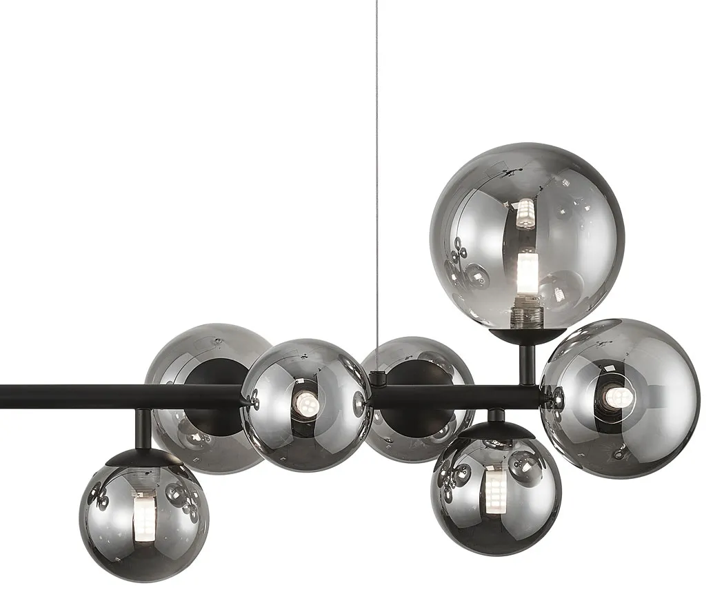 Wisząca lampa o oryginalnym kształcie oświetlonych czarnych kuli to prawdziwa perła w świecie nowoczesnego oświetlenia. Jej czarne elementy nadają lampie wyjątkowego charakteru, symbolizując elegancję, nowoczesność i pewność siebie. Metalowe detale doskonale współgrają z czernią, tworząc minimalistyczny, a jednocześnie efektowny design. Ta lampa nie tylko oświetla pomieszczenie, ale także nadaje mu indywidualności i stylu. Wykonana z najwyższą starannością z metalu i szkła, gwarantuje trwałość i funkcjonalność. Jej czarny kolor doskonale współgra z bielą, tworząc harmonijną całość emanującą nowoczesnością i elegancją, rozjaśniając przestrzeń i podkreślając jej wyjątkowy charakter. Wspaniale odnajdzie się w salonie, jadalni czy sypialni jako dekoracja i źródło oświetlenia wewnętrznego.