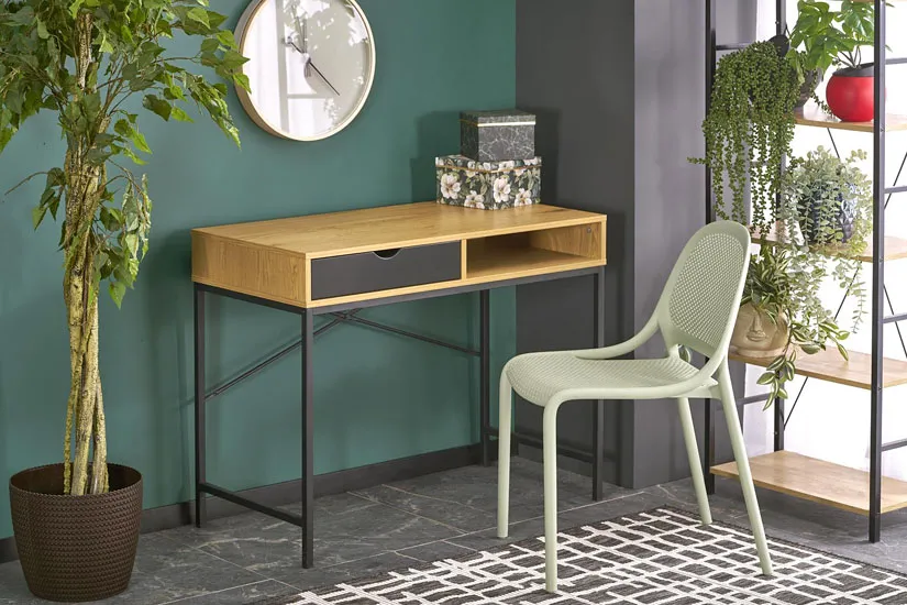 Solidne i funkcjonalne biurko. Szuflady chodzą płynnie, a całość nie zajmuje zbyt wiele miejsca. Kolorystyka bardzo przyjemna a dąb złoty ociepla pomieszczenie. Idealne do niewielkiego pokoju lub gabinetu.