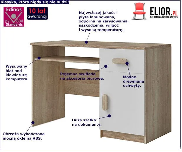 - Kolor: Biały front i korpus w kolorze dąb sonoma. Kliknij w link i sprawdź także inne biurka w stylu skandynawskim w sklepie Edinos.pl. Stwórz swój praktyczny zestaw mebli.