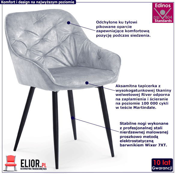 Zapewne wiesz, co wpływa na jakość mebli czyniąc je solidnymi i trwałymi na wiele długich lat. Aby stworzyć dzieło doskonałe potrzeba dwóch niesamowicie ważnych rzeczy. To najlepsze surowce i  precyzja wykonania. Dla marki Elior te właśnie aspekty są priorytetem przy tworzeniu mebli. Robimy to w trosce o Twój komfort i zadowolenie, które zdecydowanie są dla nas najważniejsze. Tworząc z pasji do piękna zwracamy szczególną uwagę na staranne wykonanie i dbałość o szczegóły, abyś Ty mógł cieszyć się trwałością przez długi czas. Krzesło Higi to także efekt pracy naszych projektantów, designerów i inżynierów. To dzięki nim krzesło może poszczycić się najwyższą jakością. Jak powstało? Otóż tapicerka stworzona jest z wysokogatunkowej tkaniny River. To szlachetna, aksamitna tkanina typu velvet. Materiał jest nadzwyczaj miękki i lekko połyskujący, co dodaje mu elegancji. River to jeden z francuskich welurów posiadający dużą odporność na ścieranie na poziomie aż do 100 000 cykli w teście Martindale. Solidna konstrukcja to najmocniejszy materiał, jakim jest profesjonalna stal nierdzewna. Dla zwiększenia trwałości została pomalowana proszkowo przy użyciu metody elektrostatycznej. Dzięki temu jest odporna na zarysowania, zadrapania, korozje, chemikalia i uszkodzenia mechaniczne. Najwyższa jakość metody natrysku proszkowego pozwoliła zaoferować nam aż 10 lat gwar. na swoje produkty. Sprawia to, że nasza propozycja jest najlepszą dostępną na rynku. Zaufaj marce Elior, ponieważ Twoje zadowolenie i komfort to nasza misja.
