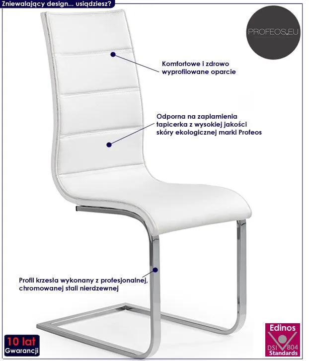 Eleganckie i komfortowe krzesło Levent wyróżnia się nie tylko swoją unikalną formą, ale także zastosowaniem materiałów najlepszej jakości. Designerska tapicerka krzesła wykonana została z najwyższej jakości ekoskóry (skóry ekologicznej), łatwej do utrzymania w czystości. Ekoskóra używana przy produkcji mebli marki Profeos jest o wiele bardziej odporna na słońce oraz wodę , co pozwala Ci na długie i bezpieczne użytkowanie. Już nie musisz się martwić, że rozlana kawa spowoduje konieczność wymiany mebla. Skóra ekologiczna marki Profeos została pokryta warstwą polichlorku winylu. Profil krzesła stworzony jest z najwyższej jakości chromowanej stali o zawartości aż stali nierdzewnej oraz chromu, co gwarantuje mu niezwykły efekt wizualny, posiadając przy tym ponadprzeciętne cechy antykorozyjne oraz lepszą odporność na uszkodzenia mechaniczne . Zewnętrzna strona oparcia krzesła w kolorze dąb sonoma wykonana została z wysokiej jakości naturalnego drewna, którego elementy zostały ze sobą zespojone w temperaturze 220 stopni Celsjusza. Materiał ten charakteryzuje się niezwykłą dokładnością wykonania, wytrzymałością oraz dużo większą odpornością na wodę od konkurencyjnych tworzyw. Jest również łatwy do utrzymania w czystości, co jest szczególnie istotne w przypadku mebli wykorzystywanych podczas posiłków. Stonowana kolorystyka sprawia, że nowe krzesło Levent świetnie odnajdzie się w przestrzeni mieszkalnej czy biurowej. Pozwól by odmieniło także Twoje wnętrze...