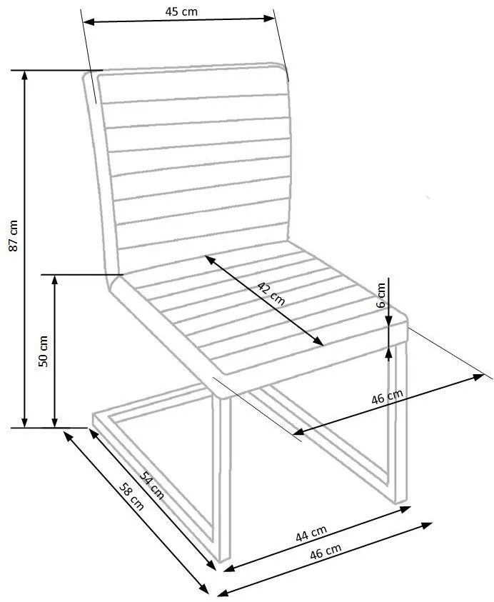 • Wymiary: wysokość całkowita: 87 cm, szerokość całkowita: 46 cm, głębokość całkowita: 58 cm, wysokość siedziska: 50 cm, głębokość siedziska: 42 cm, szerokość siedziska 46 cm.