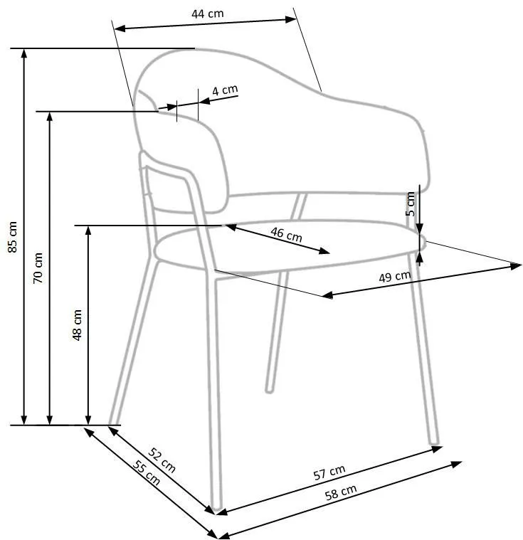 • Wymiary: wysokość całkowita: 85 cm, szerokość całkowita: 58 cm, głębokość całkowita: 55 cm, wysokość siedziska: 48 cm, szerokość siedziska: 49 cm, głębokość siedziska: 46 cm.