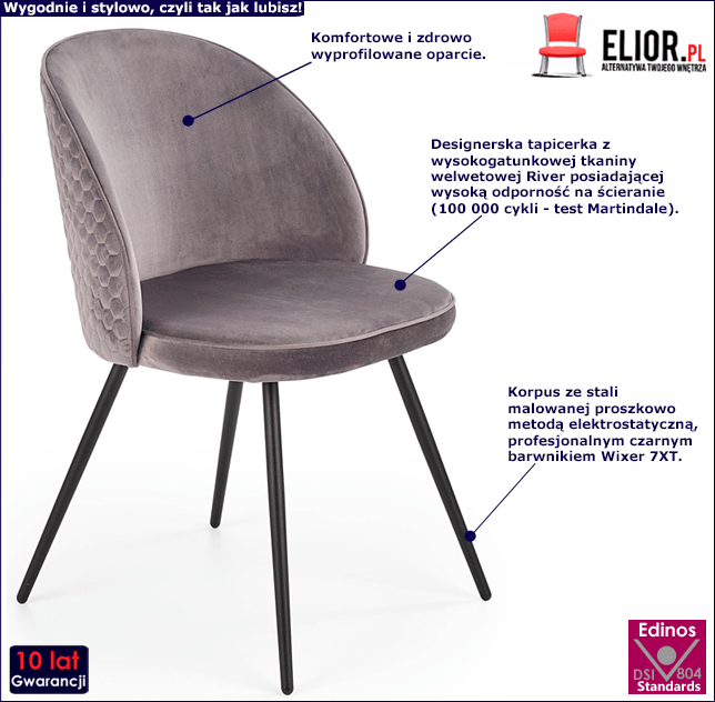 Producenci marki Elior, uważają że design musi być nie tylko wyrafinowany i odkrywczy, ale także komfortowy. Tym właśnie wyróżnia się opisywane krzesło Modes, które jest zaskakująco wygodne dzięki niezwykłej ergonomii, delikatnym liniom i stabilnej podstawie. Modes to mebel z górnej półki, który zapewni 100% satysfakcji każdemu użytkownikowi. Prezentowany model krzesła to prawdziwy majstersztyk. Producenci marki Elior zadbali o każdy szczegół. Nie znajdziesz podobnego modelu wśród produktów konkurencji. Czym się wyróżnia? Na Twoja uwagę zasługuje przepiękna tapicerka mebla. Popielata szlachetna tapicerka mebla wykonana została z wysokogatunkowej tkaniny River - to gęsta i aksamitna tkanina obiciowa typu velvet. Materiał ten jest niesamowicie miękki i aksamitny w dotyku, a do tego lekko połyskuje dodając całości elegancji. River to jeden z francuskich welurów posiadający bardzo dobrą odporność na ścieranie (do 100 000 cykli - test Martindale). Na wyróżnienie zasługuje zewnętrzna część oparcia. Producenci zatroszczyli się o jej wyjątkowy design. Tylna strona oparcia ozdobiona została eleganckimi pikowaniami, które wyglądem przypominają plaster miodu. To bardzo efektowny zabieg, który uwydatnia iście królewski charakter mebla. Atrakcyjność mebla potęgują modernistyczne, pełne wdzięku nóżki, które są zwieńczeniem precyzyjnego i niepowtarzalnego designu krzesła. Solidny korpus to stal malowana proszkowo, metodą elektrostatyczną profesjonalnym czarnym . Technika malowania proszkowego charakteryzuje się dużą trwałością, odpornością na korozję, chemikalia, wysoką temperaturę oraz uszkodzenia mechaniczne, dzięki czemu znacznie podnosi walory użytkowe i estetyczne mebla. Już nie musisz się martwić, że po kilku latach część farby odpryśnie od mebla . Na naszym krześle posiedzisz wiele długich lat. Zaproś do swojego domu produkt, który będzie cieszył Cię każdego dnia. Krzesło Modes to mebel dla Ciebie! Zapewniamy Cię, że jak na nim usiądziesz to nie zechcesz wstać. Przekonaj się już teraz!