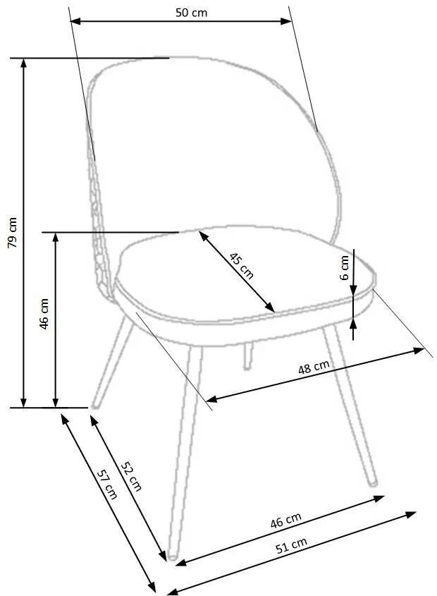 • Wymiary: wysokość całkowita: 79 cm, szerokość całkowita: 51 cm, głębokość całkowita: 57 cm, wysokość siedziska: 46 cm, szerokość siedziska: 48 cm, głębokość siedziska: 45 cm.
