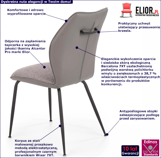 Krzesło to mebel, bez którego trudno wyobrazić sobie codzienne życie. To nieodłączny element stołu. Współczesny rynek oferuje nam całą gamę różnorodnych modeli. Marka Elior również zadbała o ten aspekt wystroju Twojego wnętrza i wzbogaciła swój asortyment o kolejny produkt. Tym razem jest to nowatorskie krzesło Cleo, które na nowo odmieni Twoje wnętrze. Styl nowoczesny to prawdziwy hit ostatnich lat. Odcienie szarości królują nie tylko na ścianach, ale także na meblach. Prezentowane krzesło Cleo idealnie wkomponowuje się w estetykę współczesnych aranżacji. Przód krzesła pokryty został jasnopopielatą tkaniną materiałową, która nieco rozjaśnia popielaty tył krzesła, który z kolei wytapicerowany został i tu uwaga: elastyczną ekoskórą. Popielata tapicerka i czarna podstawa to strzał w dziesiątkę. Meble o popielatym wybarwieniu są eleganckie, pełne klasy, stylu, znakomicie wyglądają z pozostałymi elementami wystroju. Szare meble stanowią uniwersalną bazę, w obrębie której wyczarować można dowolny styl. To znakomita propozycja mebla do nowoczesnej kuchni, jadalni czy salonu.