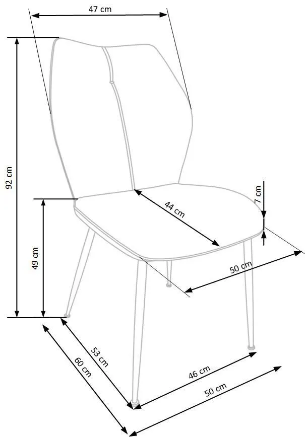 • Wymiary: wysokość całkowita: 92 cm, szerokość całkowita: 50 cm, głębokość całkowita: 60 cm, wysokość siedziska: 49 cm, szerokość siedziska: 50 cm, głębokość siedziska: 44 cm.