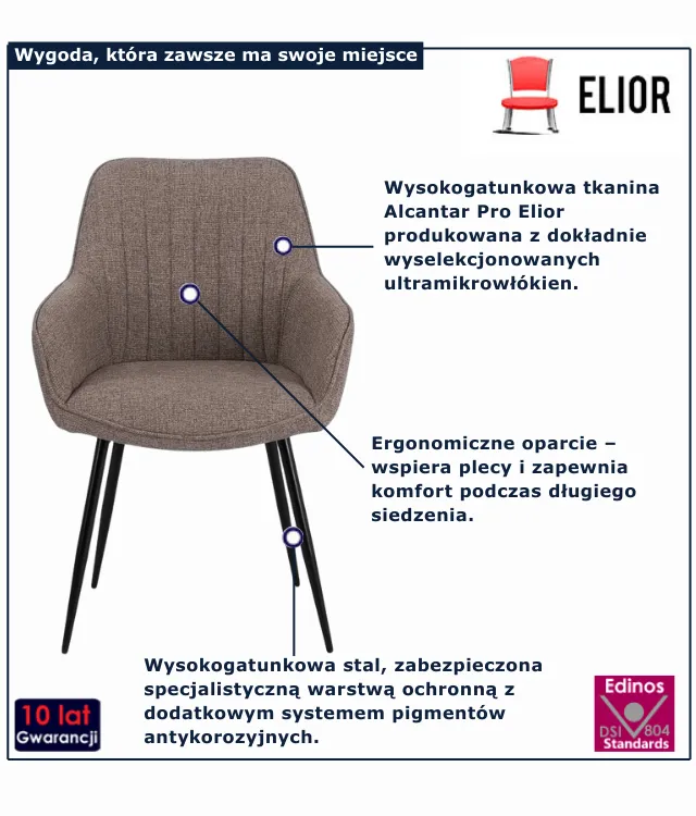 • Produkt posiada certyfikat jakości "Edinos Standards DSI 804", który potwierdza najwyższą jakość wykonania mebla oraz pełny stopień zgodności poszczególnych jednostek wytworzonego wyrobu z przyjętym wzorcem.