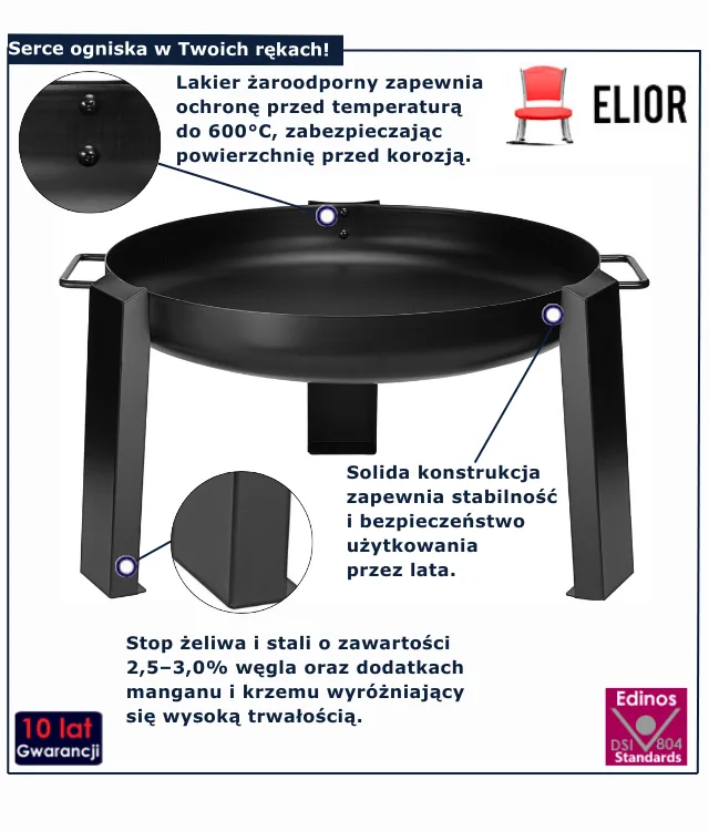 - Stabilna konstrukcja paleniska ogrodowego, zapewnia bezpieczeństwo użytkowania nawet na nierównej nawierzchni.