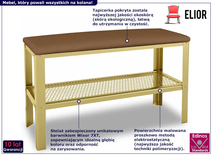 • Kolor: stelaż: złoty, siedzisko: ciemny beż. Kliknij w link i sprawdź także inne siedziska do przedpokoju w sklepie Edinos.pl. Stwórz swóją praktyczną przestrzeń.