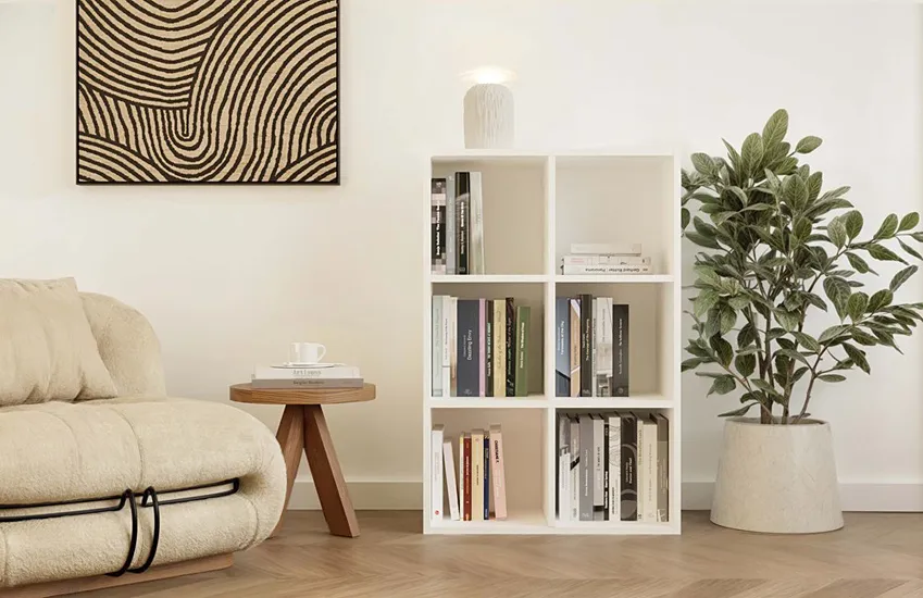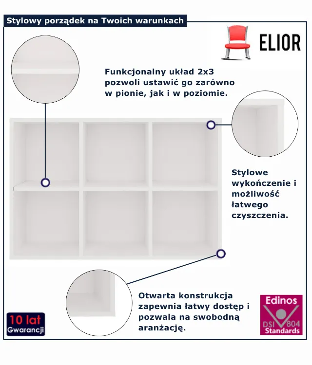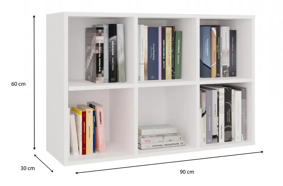 • Funkcjonalny układ 2x3 – sześć przestronnych komór ułatwia organizację książek, dokumentów, akcesoriów i przedmiotów codziennego użytku.