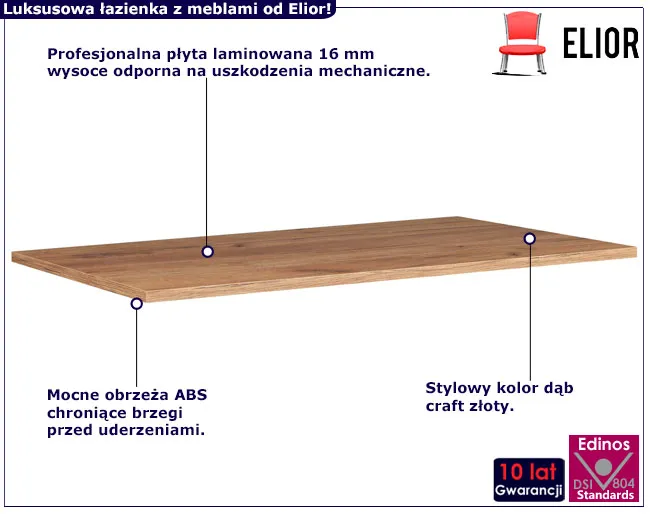 Blat Aploni 14X marki Edinos Premium to wybór, który przemieni Twoją łazienkę w oazę porządku i dobrego stylu. Nie czekaj, aby dodać do swojego wnętrza element funkcjonalnego piękna, które zachwyci każdego, kto je zobaczy. Zamów już dzisiaj ten blat i przekonaj się, jak praktyczne może być połączenie nowoczesności z tradycją w Twojej łazience. Sprawdź! Powyższa oferta dotyczy blatu 140 cm w kolorze dąb craft złoty promocyjnej w cenie 278 zł. Regularna cena tego mebla to 308 zł. Zamawiając go właśnie teraz zyskujesz aż 30 zł rabatu!