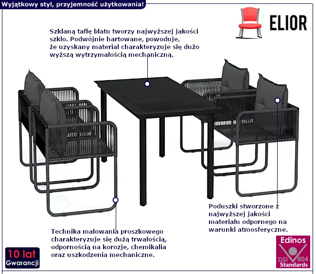 • Zestaw zawiera 1 stół, 4 krzesła i 4 poduszki na krzesła.