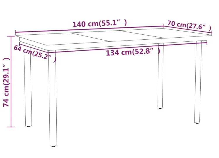 • Wymiary stołu: szerokość: 70 cm, wysokość: 74 cm, długość: 140 cm.