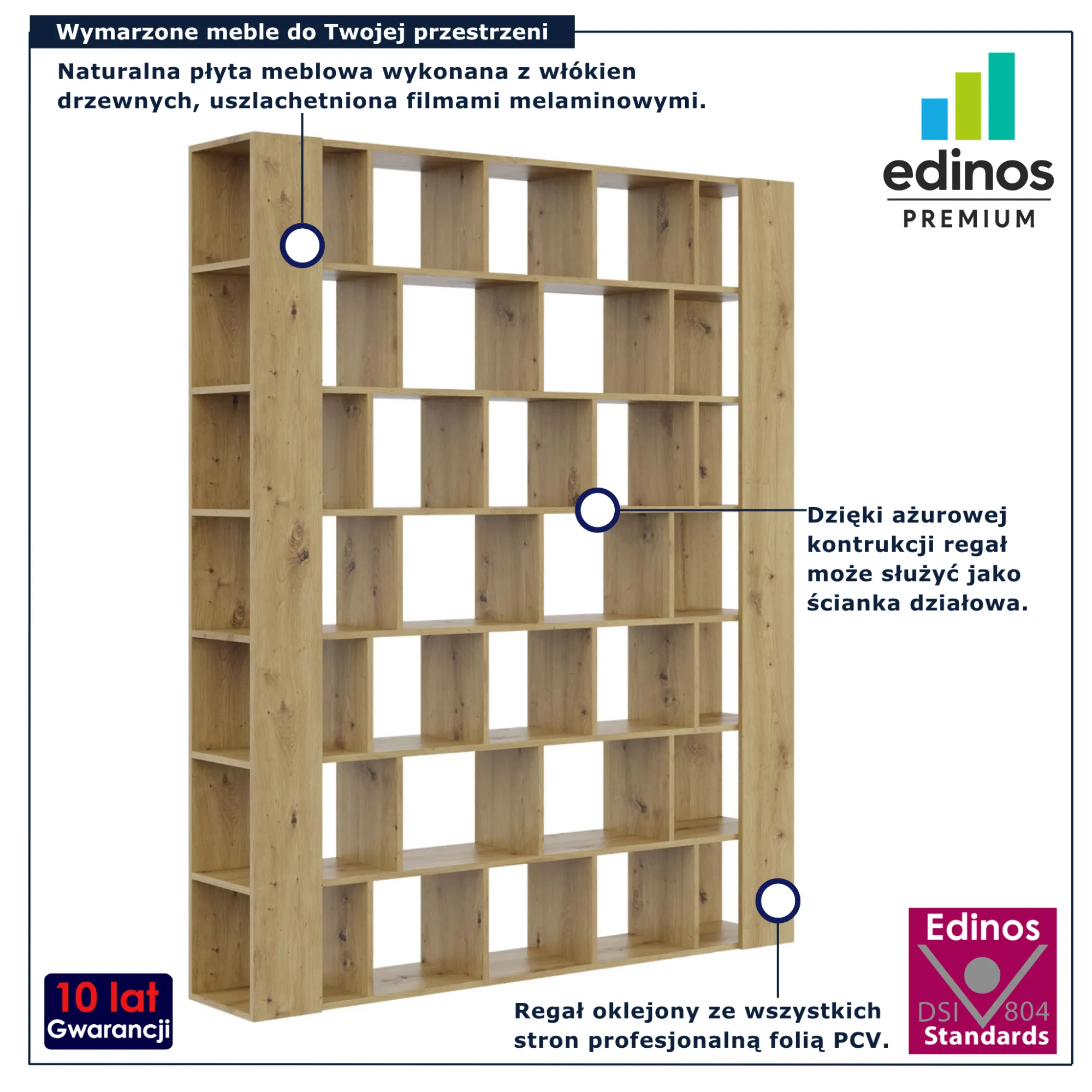 • Okleina PCV – zabezpiecza powierzchnię przed uszkodzeniami, wilgocią i zarysowaniami, dzięki czemu regał zachowuje estetyczny wygląd przez długi czas.