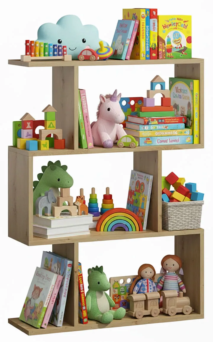 Prezentowany model regału wyróżnia się prostą formą oraz przemyślanym układem półek, który ułatwia przechowywanie zabawek, książek i dziecięcych akcesoriów. Minimalistyczna konstrukcja sprawia, że mebel nie przytłacza wnętrza i pozwala zachować wizualny porządek w pokoju dziecka. Spójna kolorystyka wprowadza do przestrzeni lekkość i naturalny charakter, dzięki czemu regał dobrze komponuje się z innymi elementami wyposażenia.