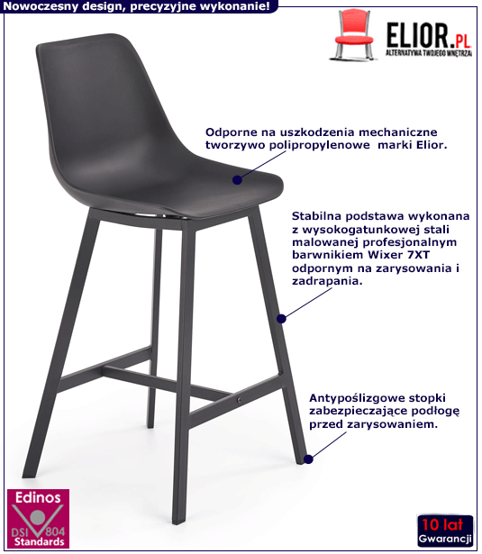 Najpiękniejsze w Emina jest to, że nie tylko zaskakuje ciekawym, modnym designem, ale także niesamowitą jakością! Dzięki wysokogatunkowym materiałom oraz precyzyjnej pracy specjalistów mamy pewność, że posłuży nam przez długi czas bez żadnych uszkodzeń. Do produkcji hokera wykorzystano poddany specjalistycznej obróbce, nowoczesny i bezpieczny surowiec. Jest to wysokogatunkowe, profesjonalne tworzywo polipropylenowe Balter Premium o klasie higieny E1, o podwyższonej wytrzymałości na nacisk od 70 do 100 MPa. Ten innowacyjny surowiec zapewnia wyjątkową trwałość i łatwość do utrzymania w czystości oraz bardzo dobre właściwości termoizolacyjne i odporność na wchłanianie wilgoci z powietrza. Ponadto tworzywo Balter Premium cechuje się odpornością na zarysowania, zaplamienia i uszkodzenia mechaniczne. Profil mebla stworzony jest z najwyższej jakości nierdzewnej stali malowanej odpornym na zarysowania i zadrapania. Najwyższa jakość techniki polimeryzacji pozwoliła zaoferować firmie Elior aż 10 lat gwar. na swoje produkty. Zapomnisz o stresie, że po kilku latach część farby odpryśnie od mebla . Emina bez wątpienia spełni Twoje absolutnie wszystkie oczekiwania służąc z radością przez długi czas!