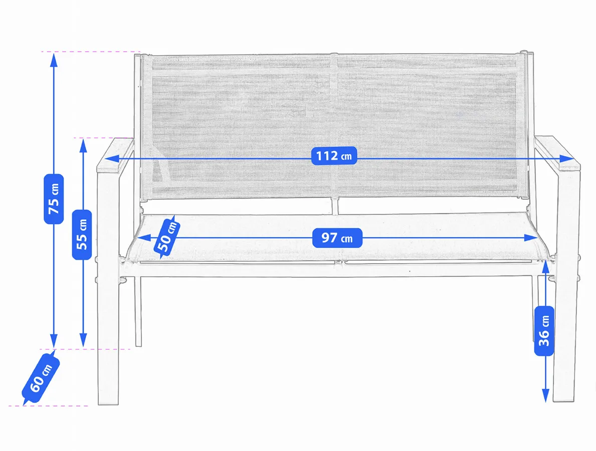 • Wymiary sofy: wysokość: 75 cm, szerokość: 97 cm, głębokość: 60 cm, maksymalne obciążenie: 240 kg.