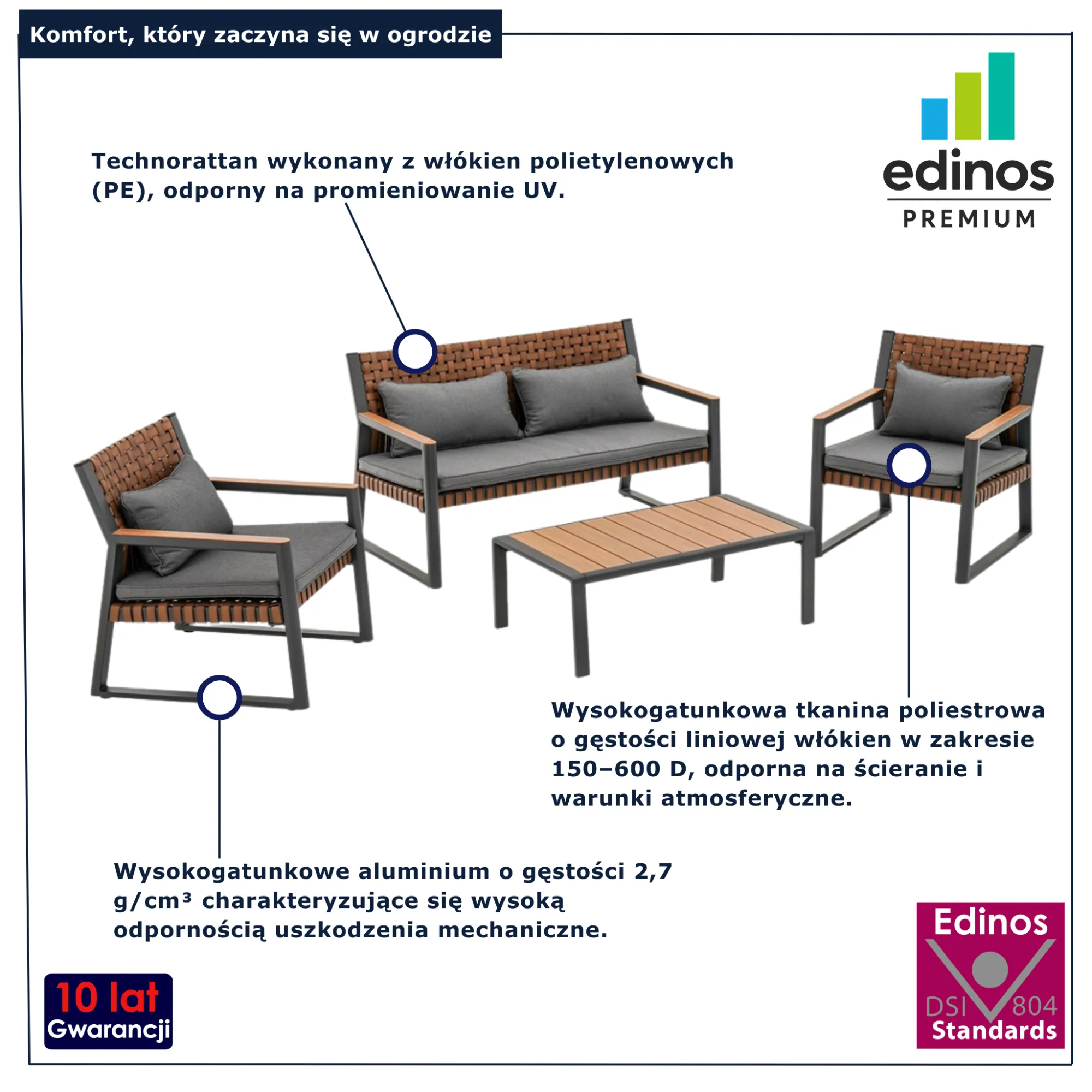 • Technorattan wykonany z włókien polietylenowych (PE) odporny na promieniowanie UV, wilgoć i zmienne warunki atmosferyczne.