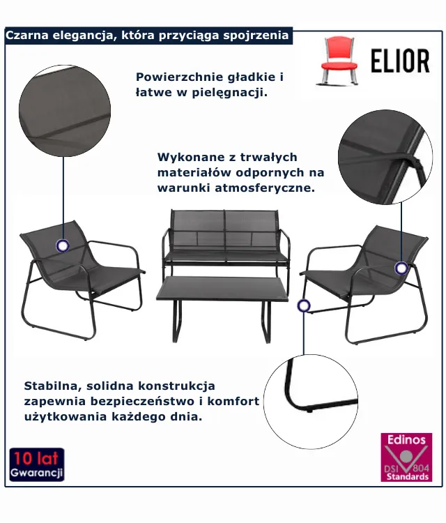 Są meble, które po prostu dobrze wyglądają. Są też takie, które zmieniają przestrzeń. Zestaw ogrodowy Kanter marki Edinos Premium należy do tej drugiej kategorii. Subtelny, czarny design wnosi do ogrodu, tarasu czy balkonu nutę nowoczesnej elegancji, a solidne wykonanie sprawia, że możesz cieszyć się jego pięknem i funkcjonalnością przez długie sezony. To komplet, który harmonijnie łączy estetykę i wygodę, pozwalając tworzyć wyjątkowe chwile – przy porannej kawie, popołudniowym relaksie czy wieczornym spotkaniu w gronie bliskich.