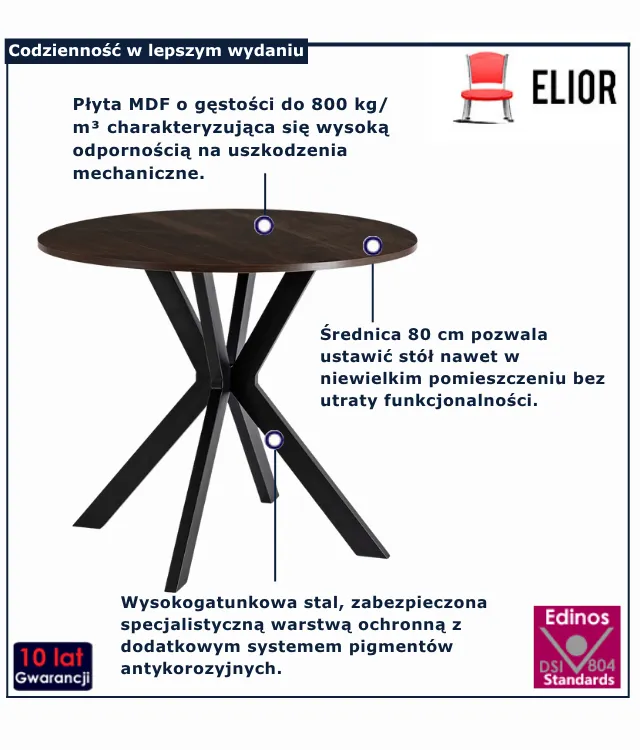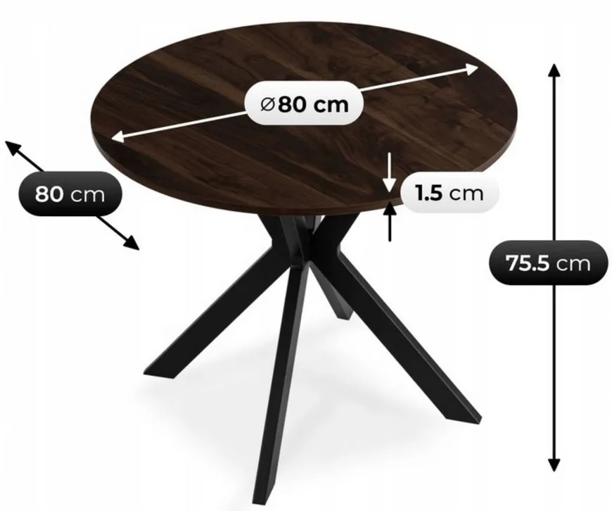 • Oszczędność miejsca – średnica 80 cm pozwala ustawić stół nawet w niewielkim pomieszczeniu bez utraty funkcjonalności.