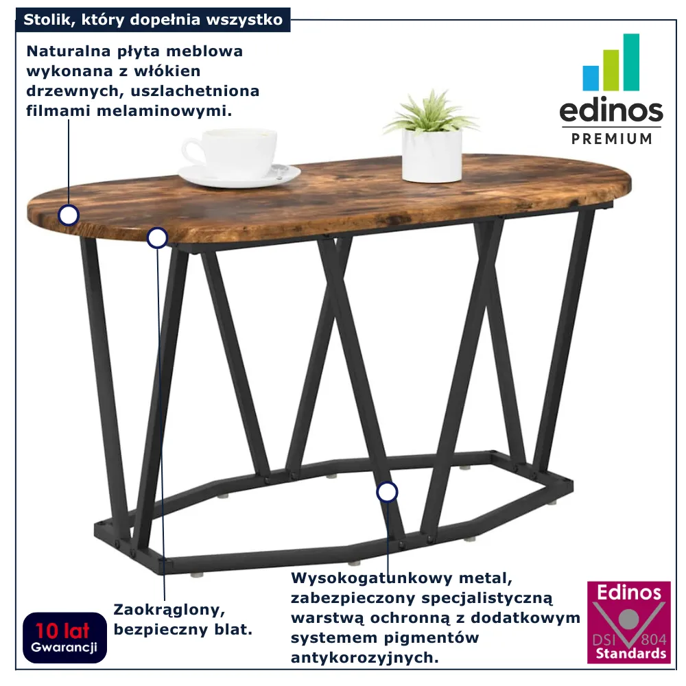 Jeśli pragniesz dodać do swojego salonu wyrazisty akcent o industrialnym charakterze, stolik kawowy owalny Ebin marki Edinos Premium będzie strzałem w dziesiątkę. Jego nietuzinkowa forma oraz kontrastowe połączenie metalu z fakturą drewna przyciągają wzrok i podkreślają nowoczesny klimat wnętrza. To doskonałe rozwiązanie dla miłośników niebanalnego designu, którzy cenią jednocześnie funkcjonalność – idealny zarówno na poranną kawę, jak i wieczorny relaks. Dzięki kompaktowej formie świetnie odnajduje się w mniejszych przestrzeniach, nie tracąc przy tym na efektowności. Zapewnia stylową oprawę codziennym momentom.