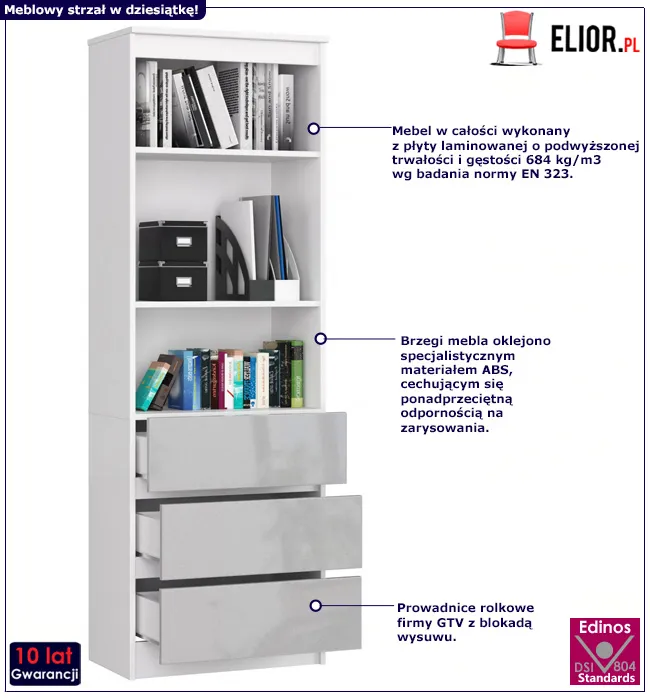 - Kolor: biały + metalik. Kliknij w link i sprawdź także inne regały i szafy w kolorze białym w sklepie Edinos.pl. Stwórz swój praktyczny zestaw mebli.