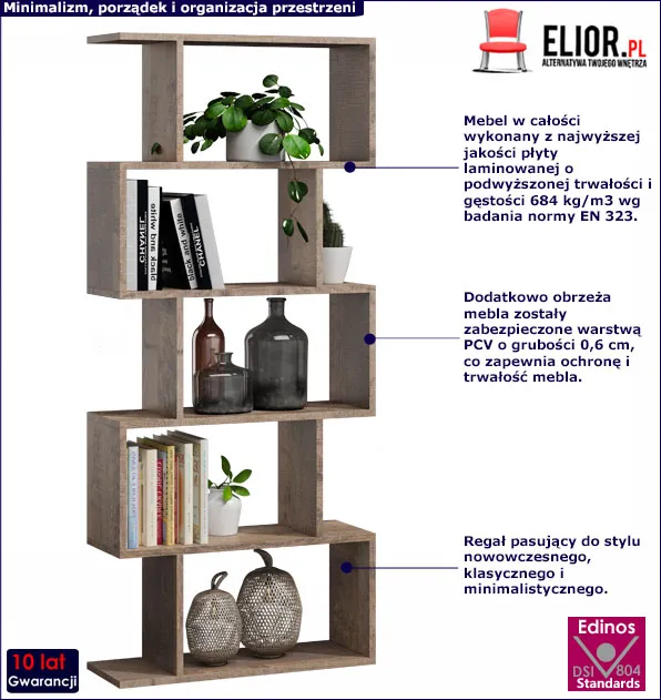 Całość mebla została wykonana z jednego, naturalnego i trwałego materiału, którym jest najwyżej jakości płyta laminowana o podwyższonej trwałości i gęstości. Zbudowana została z włókien drzewnych i związków organicznych w warunkach wysokiego ciśnienia i temperatury. Włókna ułożone są różnokierunkowo, o strukturze sinusoidalnej, co zapewnia nadanie jej cech jakościowych oraz wytrzymałościowych. Dodatkowo regał oklejono specjalistyczną warstwą ochronną PCV, cechującą się ponadprzeciętną odpornością na zarysowania. Ponadto ten zabieg sprawił, że prezentuje się on wyjątkowo estetycznie i elegancko. Meble produkowane z płyt laminowanych charakteryzują się naturalnością i trwałością, dzięki czemu meble produkowane przez wykonawców marki Edinos Premium są całkowicie bezpieczne dla ludzi i środowiska.