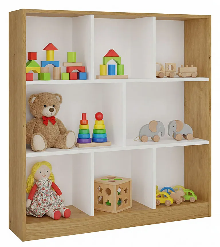 Regał na zabawki Rever to nie tylko miejsce do przechowywania, ale także sposób na estetyczne uporządkowanie dziecięcych przedmiotów. Osiem pojemnych półek pozwala wygodnie rozmieścić zabawki, książeczki, gry oraz pudełka, dzięki czemu wszystko pozostaje w zasięgu ręki dziecka. Kompaktowe wymiary sprawiają, że regał świetnie sprawdzi się w pokoju dziecięcym lub młodzieżowym, również w mniejszych przestrzeniach. Jasna kolorystyka optycznie powiększa wnętrze i nadaje mu lekkości, a uniwersalna forma sprawia, że regał łatwo dopasować do różnych aranżacji – od skandynawskich po nowoczesne.