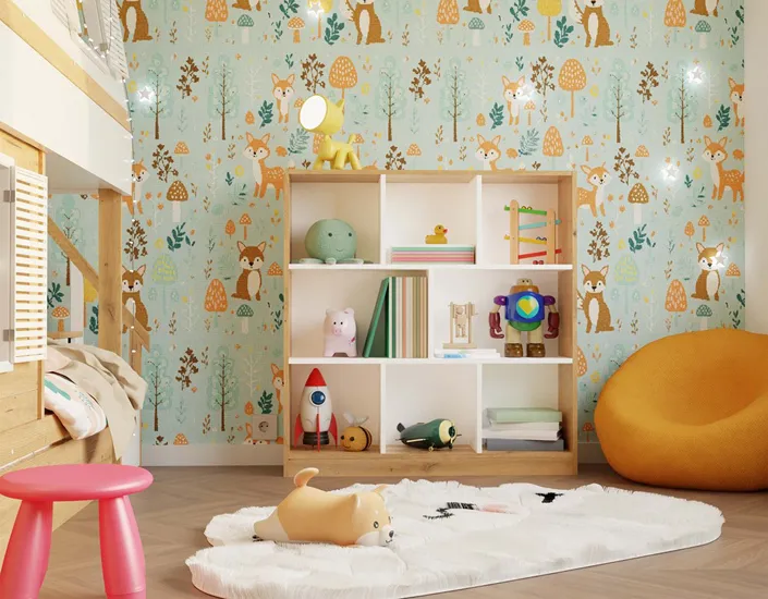 Poniżej prezentujemy przykładową wizualizację pokoju dziecięcego z wykorzystaniem regału na zabawki Rever: