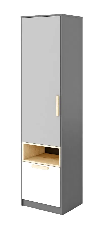 Regał w którym można skryć wszystkie ubrania czy inne rzeczy. Ładne drewniane uchwyty wybijają się na tle frontów. Szara i biała kolorystyka jest uniwersalna i zawsze pasuje do większości wnętrz - od siebie polecam :)