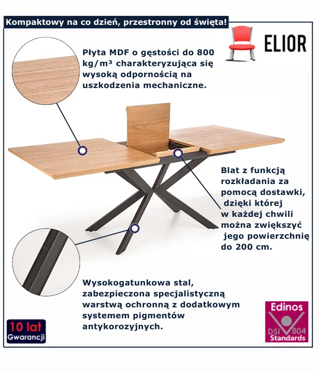 Jeśli marzysz o meblu, który będzie nie tylko piękną ozdobą wnętrza, ale też solidnym towarzyszem codziennych chwil — Mubo marki Edinos Premium będzie idealnym wyborem. Dzięki przemyślanej konstrukcji i solidnym materiałom, posłuży Ci przez lata, niezależnie od okazji. Świetnie sprawdzi się w roli centralnego punktu Twojej jadalni, przy którym każdy z domowników znajdzie miejsce dla siebie. Zastanów się – czy nie nadszedł czas, by w końcu znaleźć stół, który sprosta wszystkim Twoim potrzebom? Sprawdź jego możliwości już dziś w cenie za 2098 zł i przekonaj się, jak bardzo może odmienić Twoje wnętrze.