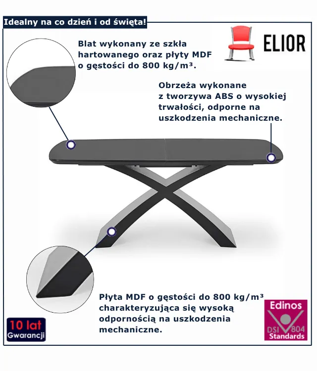 Stół, który zachwyca designem i staje się sercem domu – taki właśnie jest NYX marki Edinos Premium. To mebel, przy którym spotykają się rodzina i przyjaciele, tworząc niezapomniane chwile. Dzięki dużemu blatowi z łatwością pomieścisz przy nim wszystkich bliskich, a po rozłożeniu – nawet 8 osób. Szukasz stołu, który będzie równie stylowy, co praktyczny? NYX to odpowiedź na Twoje potrzeby.