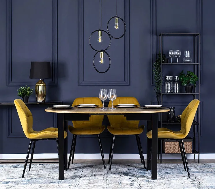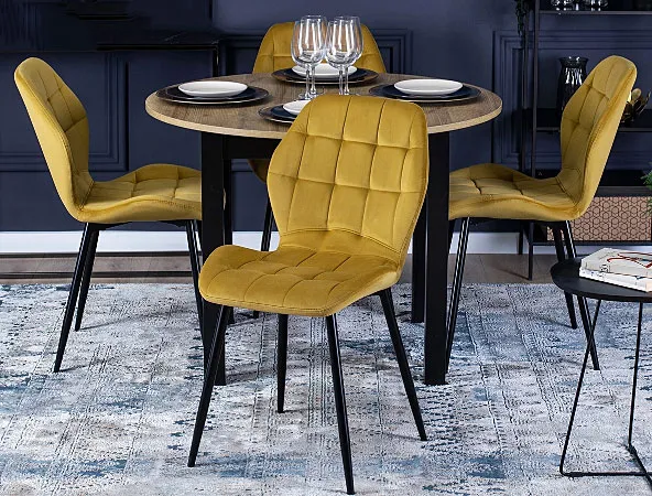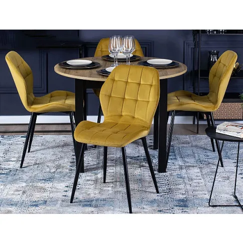 • okrągły blat stołu w odcieniu dębu craft idealnie łączy się z czarnymi nogami i musztardowymi krzesłami tworząc estetycznie zachwycającą całość