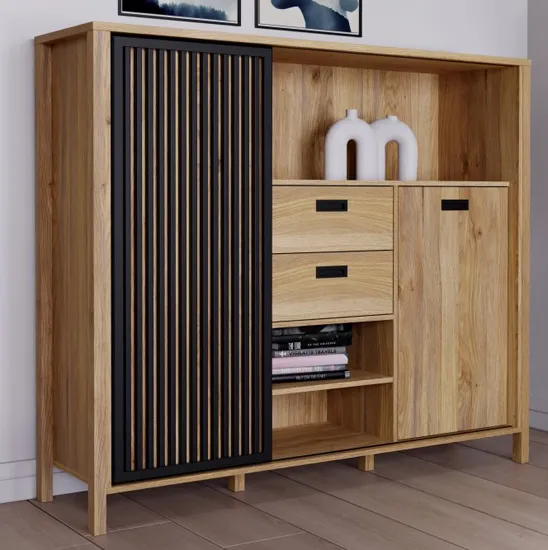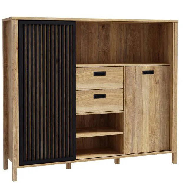 Komoda Dimon 6X została zaprojektowana tak, by maksymalnie ułatwić organizację 2 pojemne szuflady na prowadnicach z pełnym wysuwem, zamykana szafka i przesuwne drzwi z lamelami skrywające dodatkowe wnęki tworzą funkcjonalną całość, która łączy praktyczność z unikalnym wyglądem.