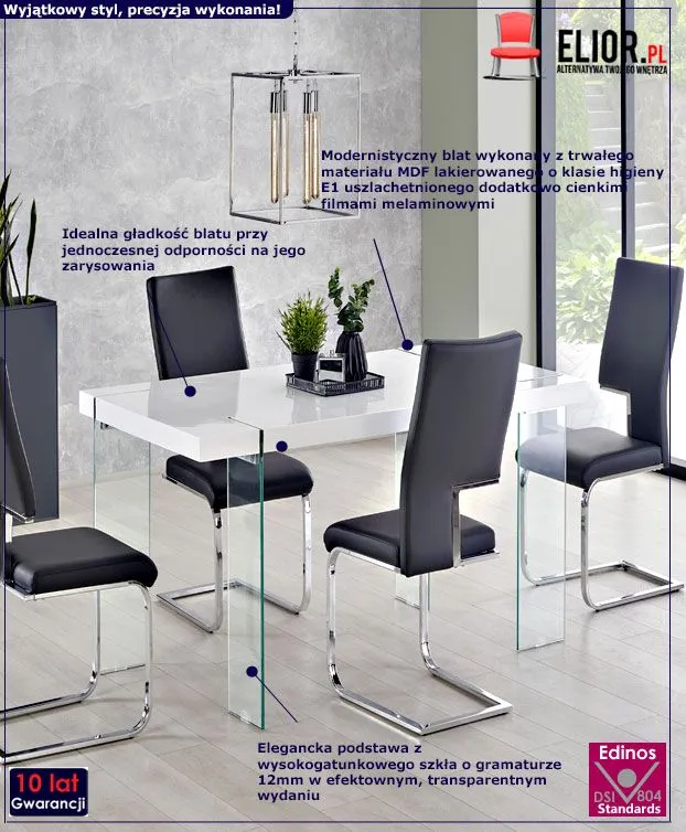Kolekcja mebli Elior to zawsze synonim ponadprzeciętnej trwałości i staranności wykonania. Taki też jest modernistyczny stół Ardea. Blat mebla został zaprojektowany z wysokiej jakości materiału MDF lakierowanego o klasie higieny E1. Blat dodatkowo uszlachetniono cienkimi filmami melaminowymi, by zwiększyć jego wytrzymałość. Posiada on specjalistyczne włókna ułożone różnokierunkowo o strukturze sinusoidalnej, co zapewnia nadanie mu cech jakościowych oraz trwałościowych. Użyte do produkcji podstawy mebla szkło o idealnej gramaturze 12mm to z kolei surowiec o niebywałej oporności na zarysowania mechaniczne. Szkło nie tylko wygląda perfekcyjnie, lecz przede wszystkim wyróżnia się ponadprzeciętną stabilnością. Z wysokogatunkowym blatem tworzy więc naprawdę solidny i wytrzymały zestaw.