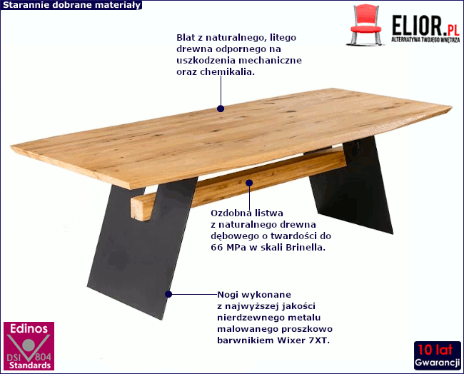 Szukając stołu do jadalni przede wszystkim zwracamy uwagę na jakość użytych materiałów, ponieważ będziemy używać go codziennie i nie chcemy, żeby szybko się zniszczył lub stracił na funkcjonalności. Tworząc stół Cosa 2X projektanci marki Elior starannie dobrali do tego celu najlepsze materiały. Stabilne nogi wykonano z najwyższej jakości metalu malowanego proszkowo odpornym na zarysowania i zadrapania. Najwyższa jakość techniki metody natrysku proszkowego pozwoliła zaoferować firmie Elior aż 10 lat gwar. na swoje produkty. Technika malowania proszkowego charakteryzuje się dużą trwałością, odpornością na korozję, chemikalia, wysoką temperaturę oraz uszkodzenia mechaniczne, dzięki czemu znacznie podnosi walory użytkowe i estetyczne mebla. Przestronny blat wykonano z naturalnego drewna o wysokiej odporności na uszkodzenia mechaniczne oraz czynniki chemiczne. Dodatkowo drewno jest materiałem ekologicznym, a do tego trwałym, bezpiecznym i przyjaznym dla zdrowia użytkownika.