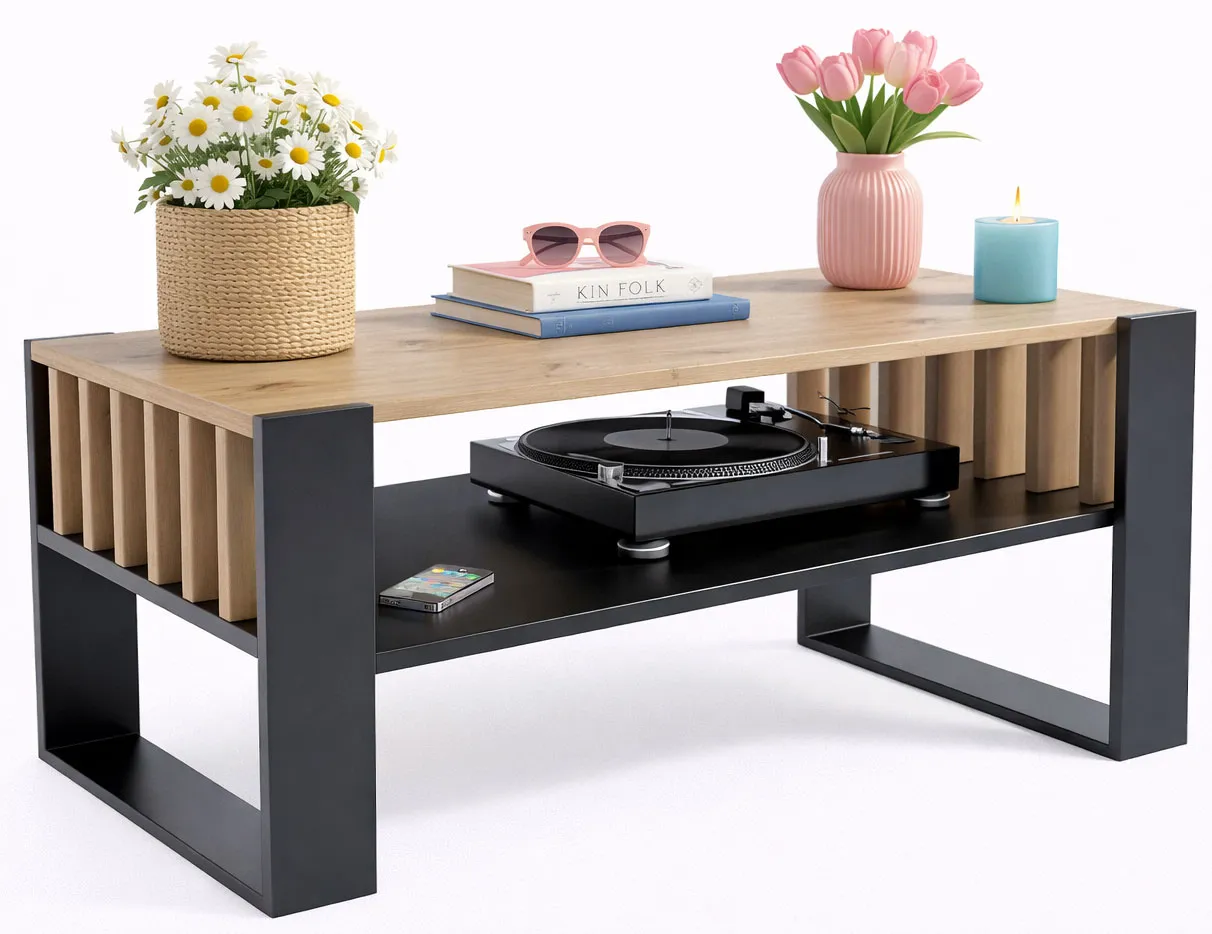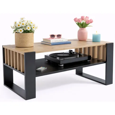 Dotyczy: Nowoczesna ława kawowa z lamelami czarny + dąb artisan - Hestra 3X