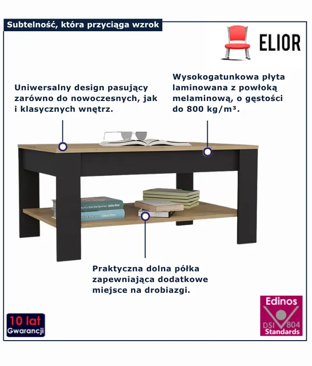 Ława Orom marki Edinos Premium to nie tylko mebel – to codzienny towarzysz chwil relaksu, rodzinnych rozmów i spotkań z przyjaciółmi. Jej obecność wprowadzi do wnętrza poczucie ładu oraz elegancji, a przy tym zachowa pełną funkcjonalność. Dzięki niej salon stanie się miejscem, w którym chętniej spędzasz czas i do którego chcesz zapraszać gości. Niezależnie od tego, czy ustawisz na niej kawowy zestaw, dekoracyjny wazon czy laptopa – zawsze spełni swoje zadanie. Wybierz ławę Orom i przekonaj się, jak mały element potrafi odmienić codzienność teraz w rewelacyjnej cenie 238 zł.