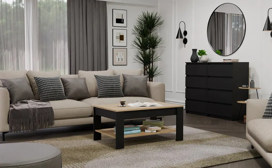 Bardzo udany stolik kawowy! Nowoczesny design z czarnymi detalami i półką pod spodem sprawia, że jest praktyczny i ładnie się prezentuje w salonie. Półka to duży plus - można tam schować książki lub piloty, a blat ma dobrą wielkość na kawę i przekąski. Całość wydaje się solidnie wykonana i stabilna, więc serio warto.
