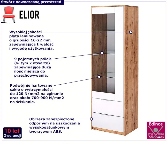 Regał z witryną Zenta 7X marki Edinos Premium to jeden z mebli z kolekcji Azarox. Jego nowoczesny styl z łatwością odnajdzie się w każdym mieszkaniu, przyciągając wzrok swoim wyjątkowym designem. Połączenie barw tworzy harmonijny duet, przyciągając elegancją, a przezroczyste szklane półki dodają całości lekkości. Azarox nie tylko oferuje przestrzeń do eksponowania ulubionych dodatków w elegancki sposób, ale również zapewnia miejsce do przechowywania niezbędnych przedmiotów. Jego przemyślana konstrukcja sprawdzi się zarówno w niewielkich, jak i przestronnych pomieszczeniach, odpowiadając na różnorodne potrzeby użytkowników.